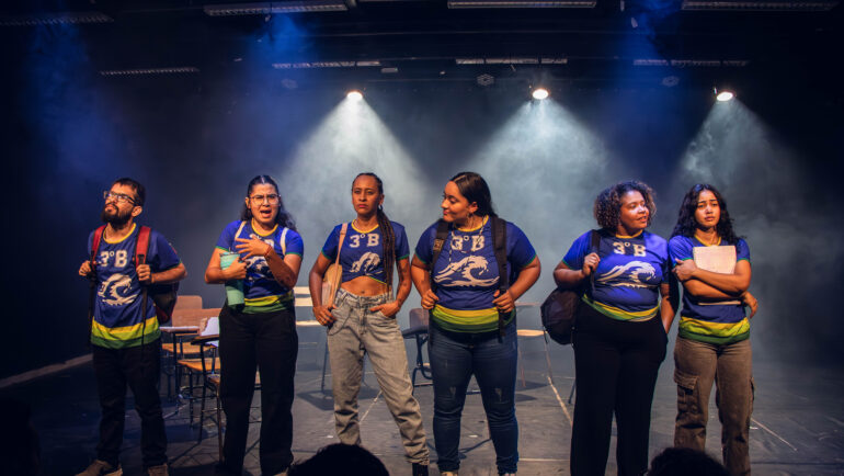 Com uma encenação simples, onde os elementos cênicos que enfatizam o espaço proposto resumem-se às carteiras e ao fardamento que compõem os figurinos, os corpos jovens em cena reorganizam a si mesmos e aos objetos continuamente, mudando a paisagem imagética a cada conflito, mesmo que esta siga uma linearidade de cores e formas. A força da encenação traduz-se na potência da dramaturgia e na capacidade expressiva de todos os atores e atrizes em cena, jovens entre 18 e 24 anos que preenchem o espaço cênico com tal presença, que torna difícil se perder dos diálogos e não se sentir imerso nas situações vivenciadas pelas personagens. A jovialidade do elenco e a ausência de qualquer exacerbação técnica comum a certos atores e atrizes, acaba por capturar o espectador em uma abordagem cênica crua, viva, dinâmica e lúdica. Minha memória faz unir a experiência de assistir essa obra à outras duas encenações que pude acompanhar durante a Mostra Internacional de Teatro de São Paulo em 2019, onde adolescentes e jovens também compunham o elenco e traziam discursos pertinentes às suas vivências e aos seus corpos, reiterando lugares de fala em montagens cênicas. As obras eram: “Paisagens para não colorir” do Teatro La Re-Sentida (Chile) e “Cinco Peças Fáceis” de Milo Rau (Bélgica), ambos com críticas publicadas por mim neste site.